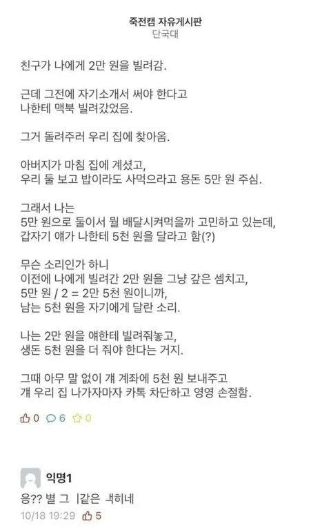 2만원 빌려줬는데 5천원 갚으라는 친구 작성자 정보 고라니 작성 작성일 2025.08.10 13:16 컨텐츠 정보 1,057 조회 목록 본문 2만원 빌려줬는데 5천원 갚으라는 친구 관련자료 댓글 0 등록된 댓글이 없습니다. 로그인한 회원만 댓글 등록이 가능합니다. 목록