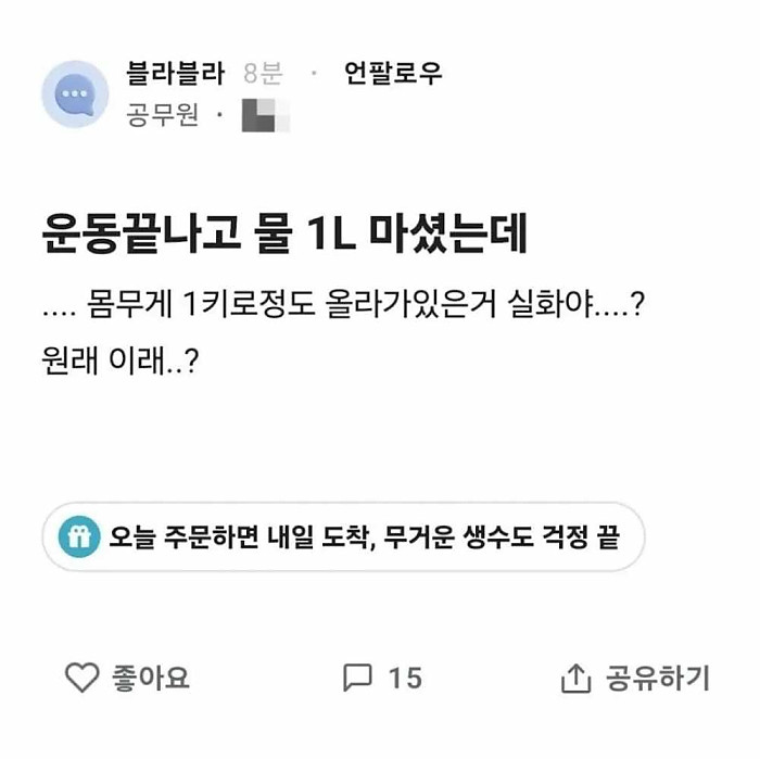 운동 끝나고 물 1L 마셨는데 작성자 정보 농구분석가 작성 작성일 2025.08.13 14:13 컨텐츠 정보 1,541 조회 목록 본문 공무원은 어떻게 된건지...... 관련자료 댓글 0 등록된 댓글이 없습니다. 로그인한 회원만 댓글 등록이 가능합니다. 목록