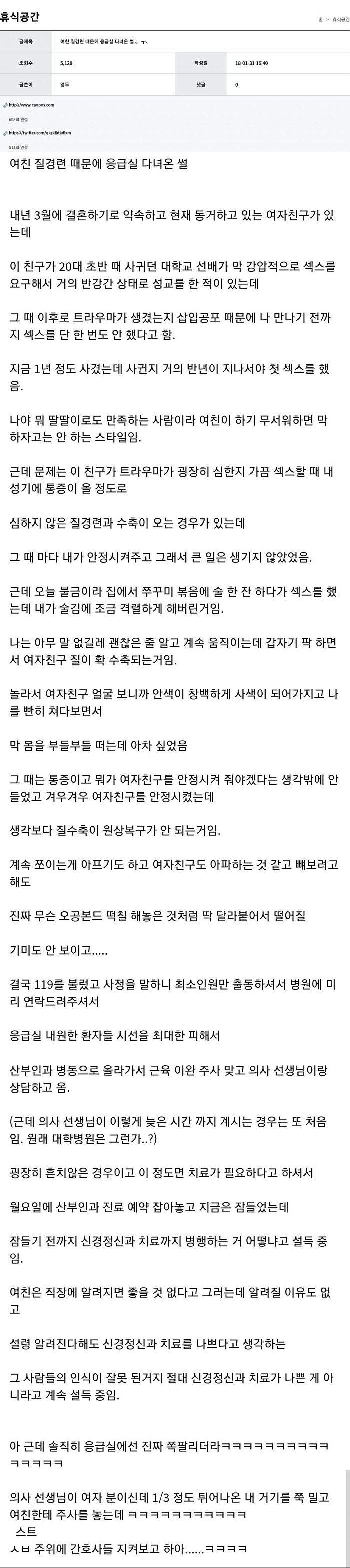 여친 질경련 와서 응급실 간 썰 작성자 정보 네임밸류 작성 작성일 2025.08.11 19:33 컨텐츠 정보 1,801 조회 목록 본문 ㅋ 관련자료 댓글 0 등록된 댓글이 없습니다. 로그인한 회원만 댓글 등록이 가능합니다. 목록
