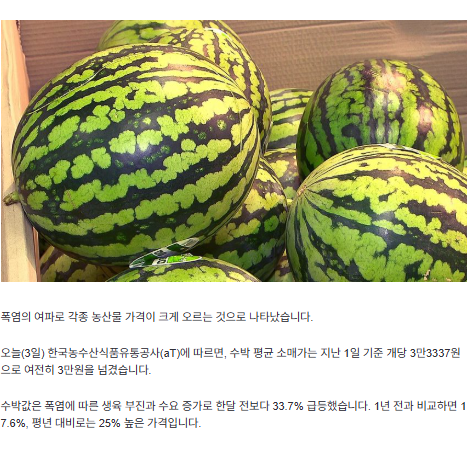 세상에나 수박 1통 가격이 미쳤네 작성자 정보 볼카츠 작성 작성일 2025.08.03 11:18 컨텐츠 정보 2,121 조회 1 댓글 목록 본문 뭘 먹으라는 건지.... 관련자료 댓글 1 프라임님의 댓글 프라임 작성일 2025.08.03 11:19 수박 1통 만원 초중반이면 딱 적당한 가격인데 수박 1통 만원 초중반이면 딱 적당한 가격인데 로그인한 회원만 댓글 등록이 가능합니다. 목록