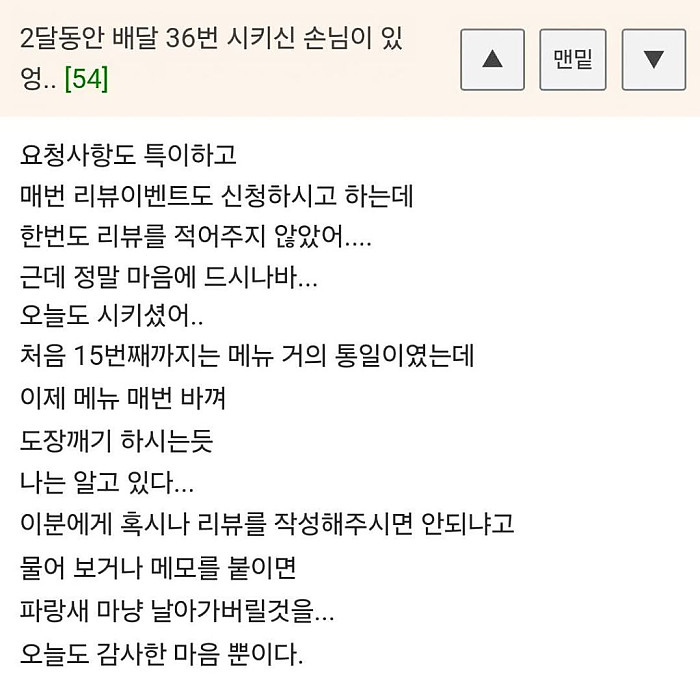 2달간 배달 36번 시킨 손님 작성자 정보 메모리즘 작성 작성일 2025.08.15 17:39 컨텐츠 정보 1,407 조회 목록 본문 ㅎ 관련자료 댓글 0 등록된 댓글이 없습니다. 로그인한 회원만 댓글 등록이 가능합니다. 목록